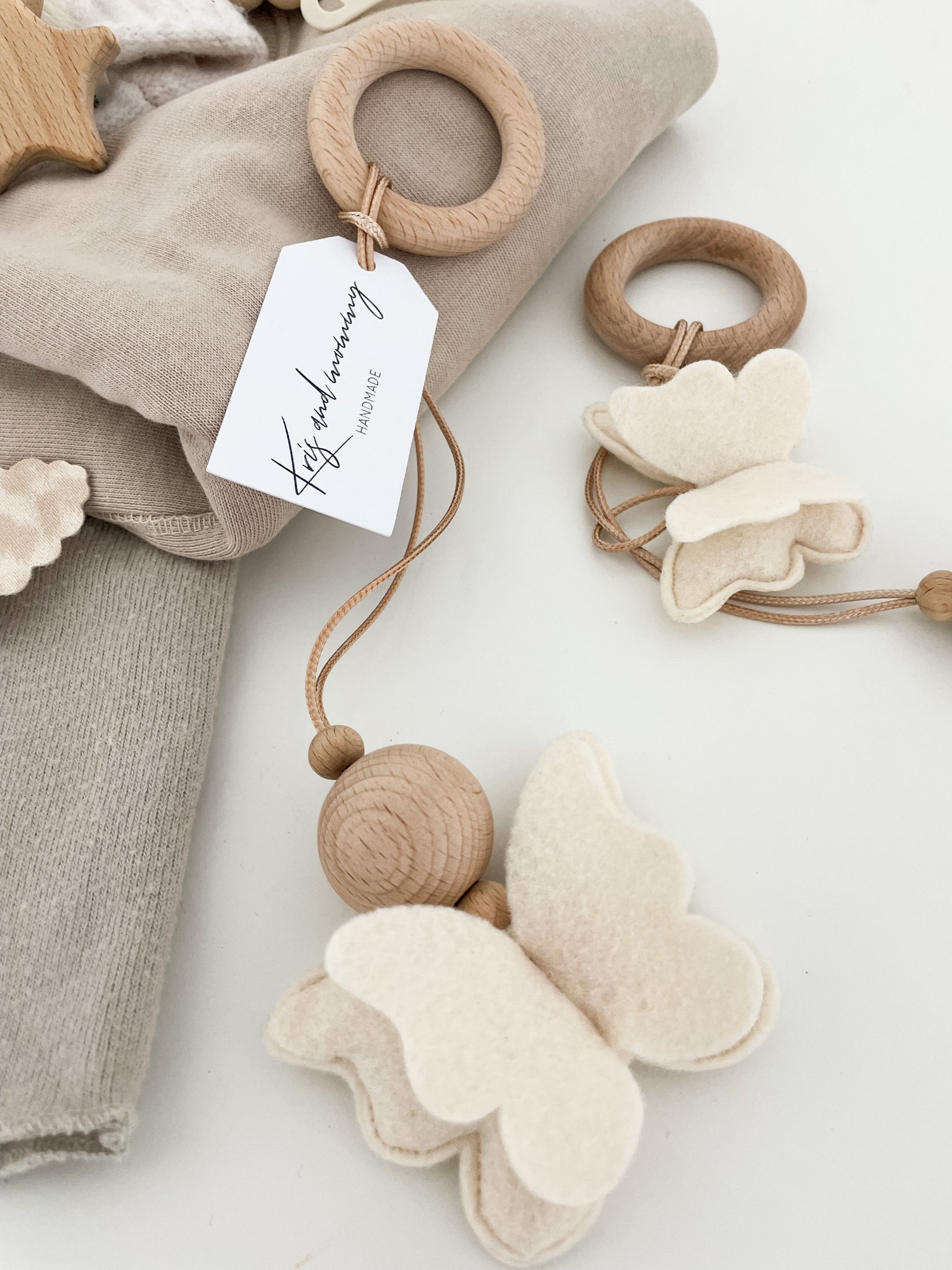 Dodajte pridih topline v otroško sobo z našim čudovito ročno izdelanim dekorativnim metuljčkom - Butterfly. Metuljček je idealen za dekoracijo sten, polic ali otroških kotičkov, saj prinaša veselje in igrivost v vsak prostor. Je popoln dodatek za ustvarjanje prijetnega in ustvarjalnega okolja, kjer se vaši malčki lahko igrajo in sanjajo. Narejena je iz mehkega filca in bukovih lesenih perlic.