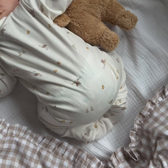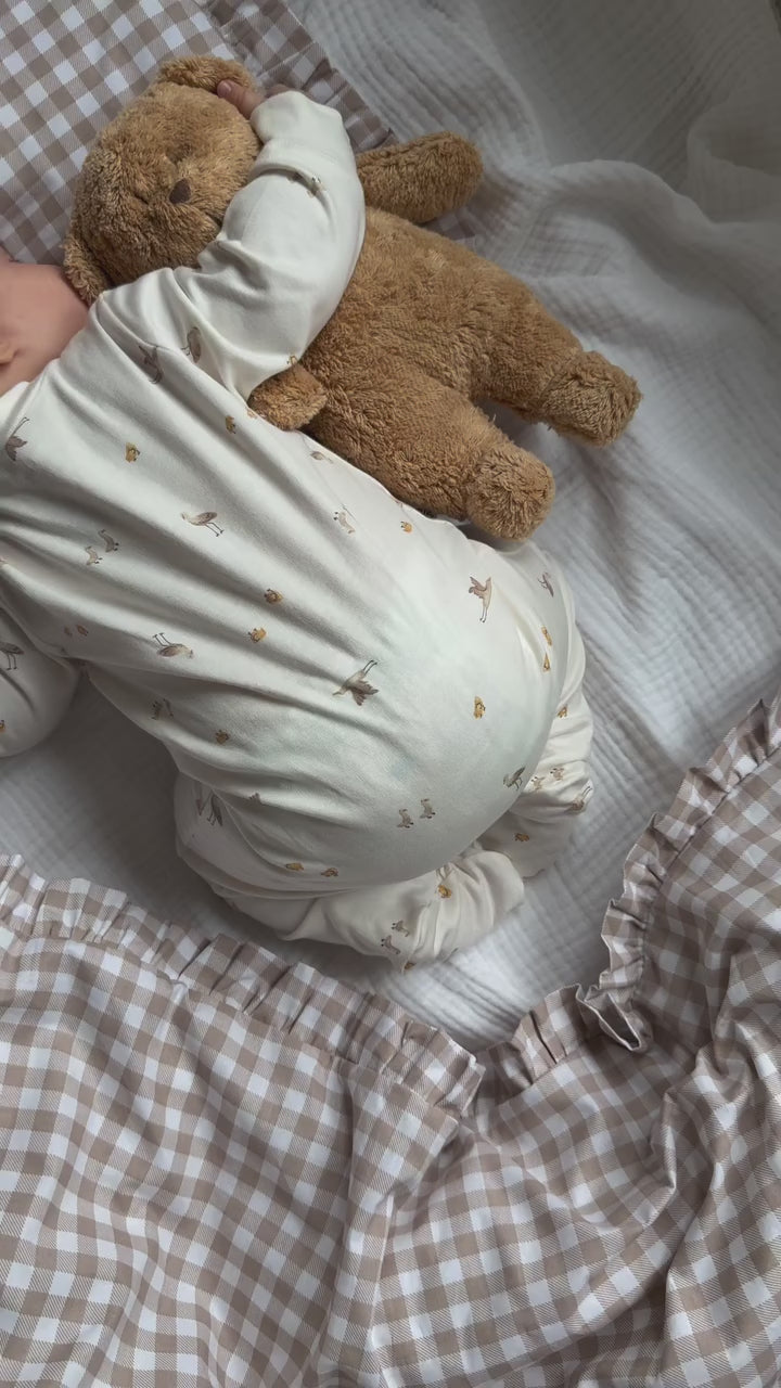 Moonie medvedek je izdelan iz najkakovostnejšega organskega bombaža, materiali pa imajo certifikat OEKO-TEX, kar pomeni, da so popolnoma varni za dojenčke. Poleg tega so izjemno mehki in prijetni na dotik – popolni za občutljivo otroško kožo.