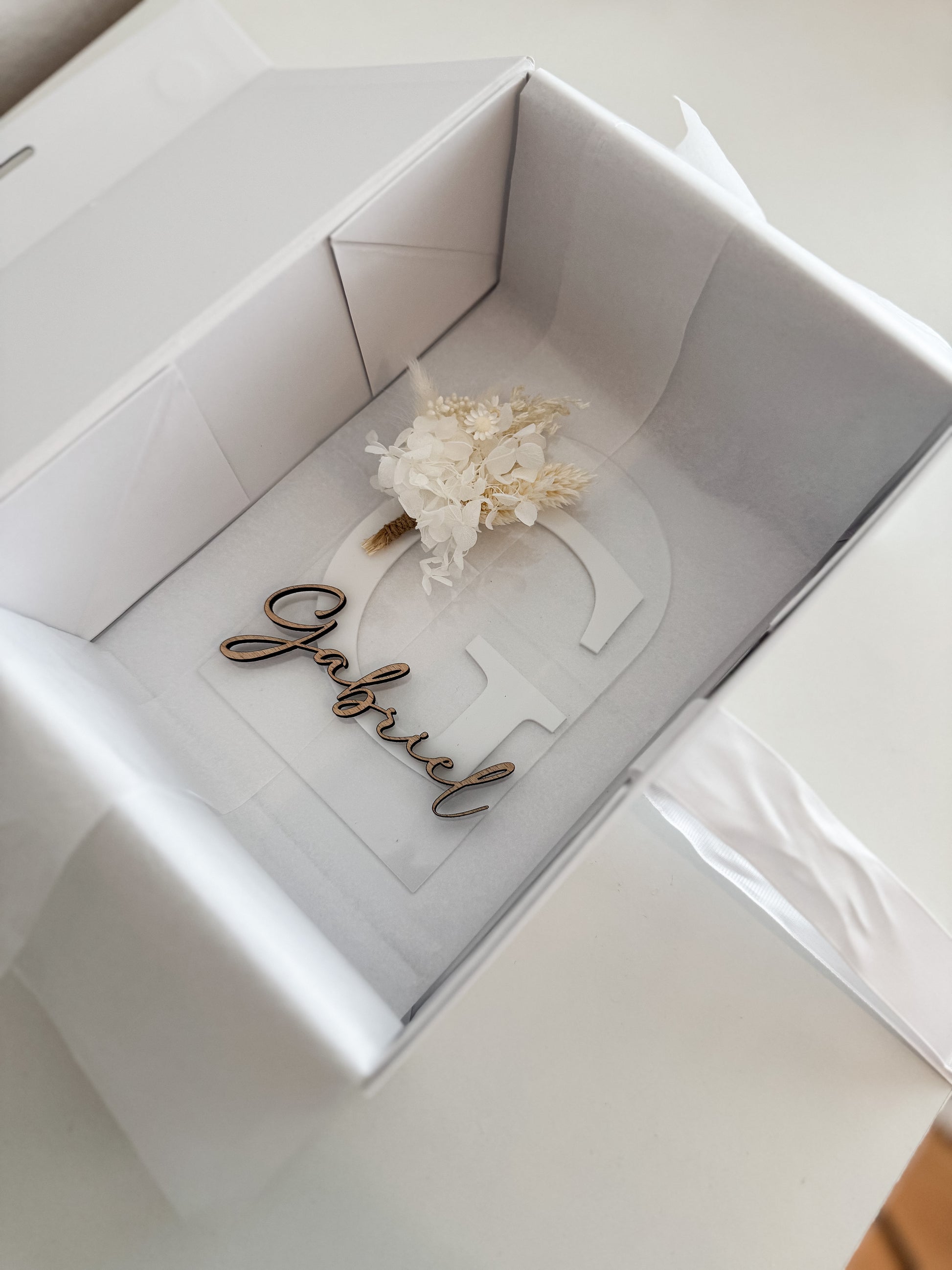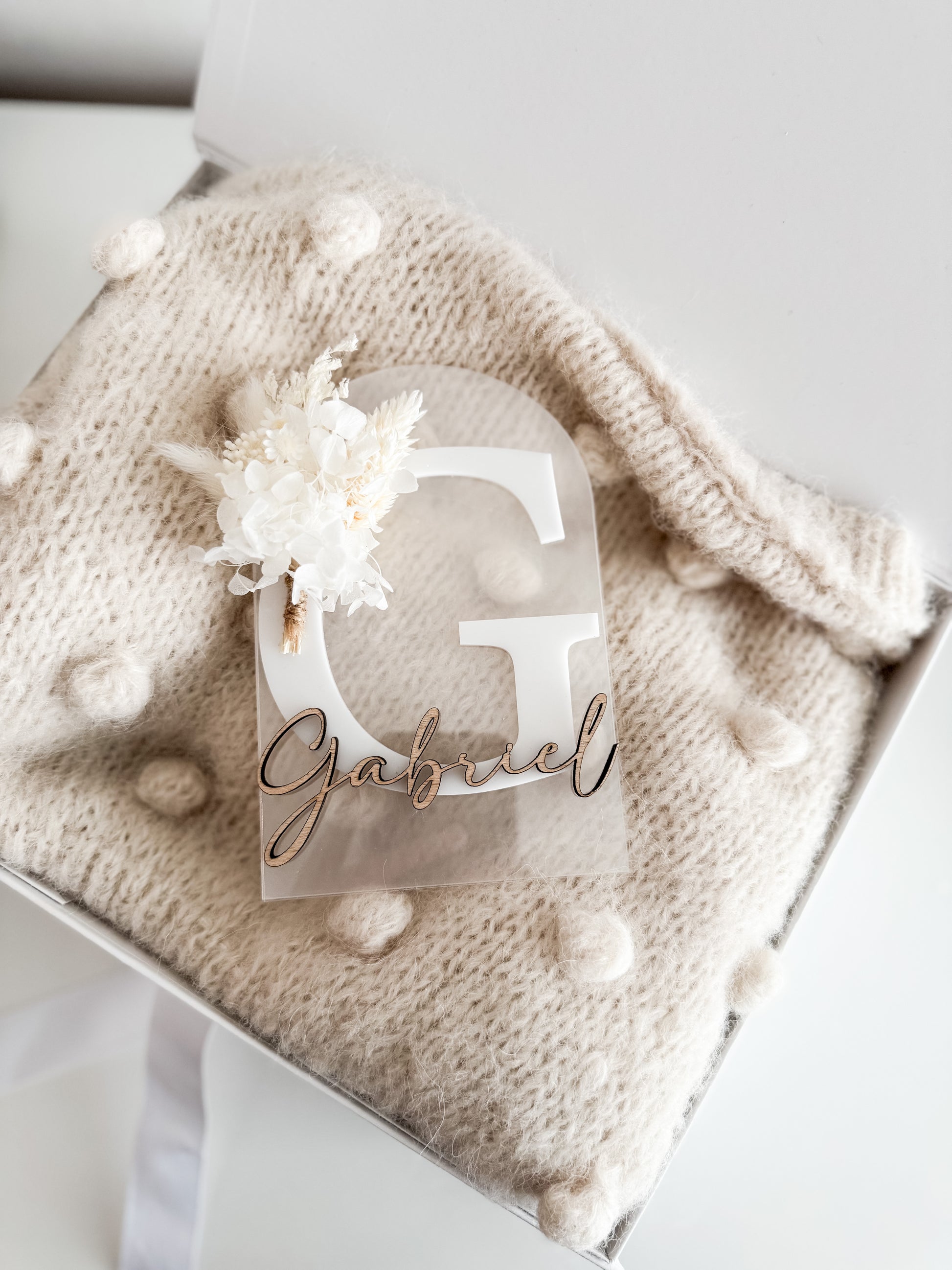 Oznanitvena kartica z imenom, veliko začetnico in suhim šopkom