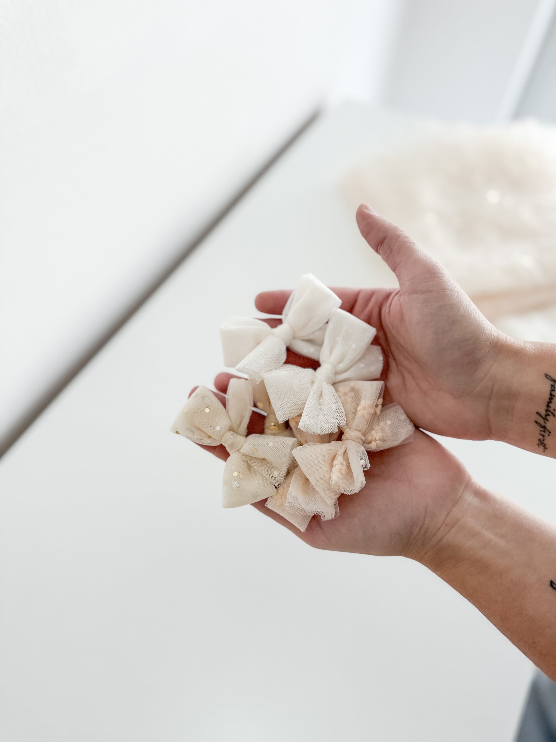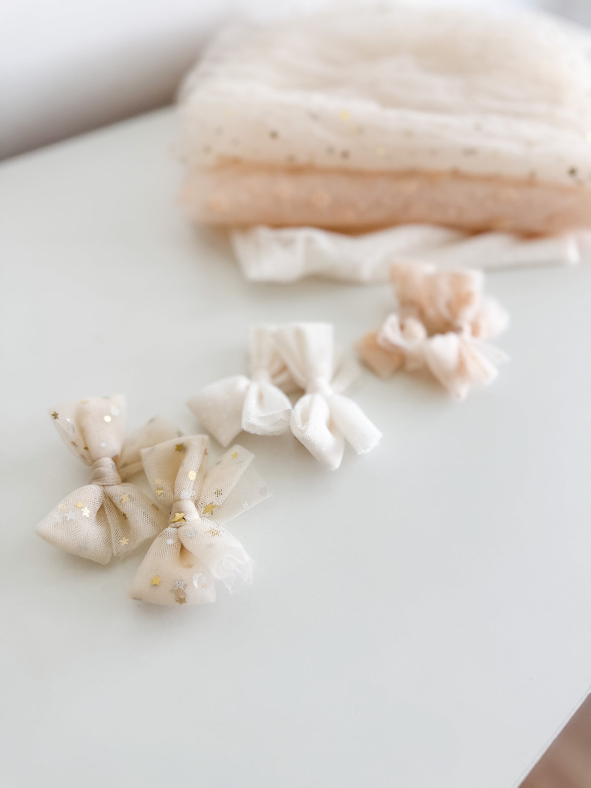 Set dveh špangic iz tila v obliki mašnjice je eleganten in prikupen dodatek za lase, ki prinaša romantičen pridih vsaki pričeski. Mašnjice so izdelane iz lahkotnega in prosojnega tila, ki jih naredi izjemno nežne in očarljive. Ta set je popoln za posebne priložnosti, kot so rojstni dnevi, poroke ali fotografiranja, a je prav tako vsestranski in primeren za vsakodnevno nošenje. Oblika mašnjic omogoča raznovrstne možnosti stiliranja, ki bodo obogatile videz deklic in odraslih. Špangice se lepo prilegajo lasem in jih nežno, a zanesljivo držijo na mestu.